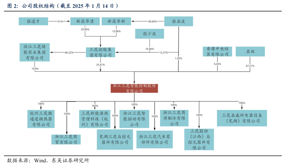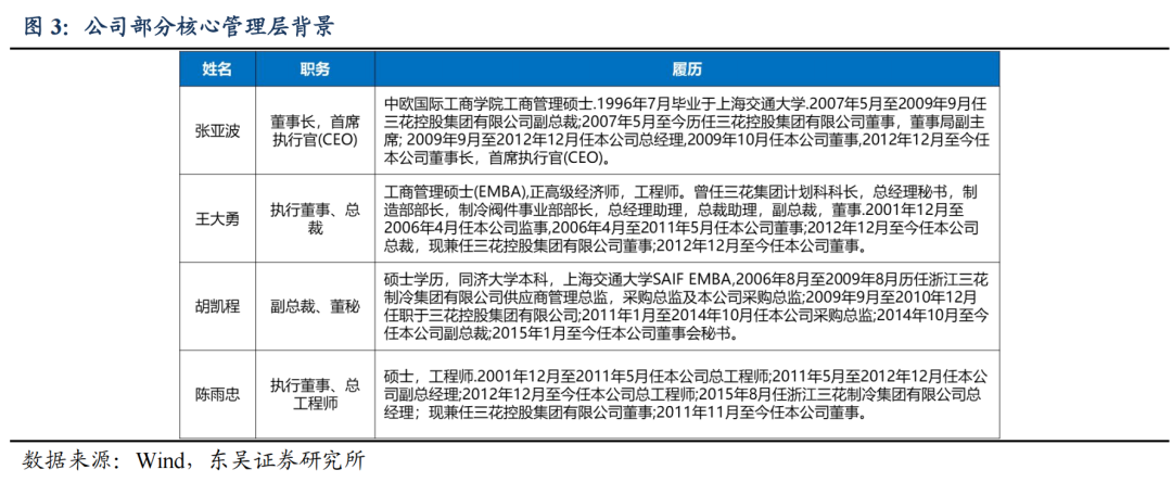 公司股权结构稳定,实控人为张氏家族。公司的实际控制人为张道才、张亚波和张少波父子三人,三人直接或者间接持有公司股份超过50%。张道才自 1984 年起历任新昌县制冷配件厂、浙江省新昌制冷配件总厂厂长,浙江三花集团公司党委书记、董事长兼总经理,浙江三花集团有限公司党委书记、董事长兼总裁等。董事长张亚波系公司创始人张道才长子,公司董事张少波系张道才次子。公司股权相对集中,更有利企业对重大事项的决策。