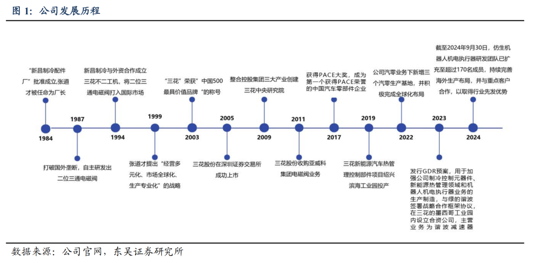 深耕制冷领域四十年,布局汽零业务,打造热管理全球龙头,机器人机电执行器将成为新的增长动力。上市前公司以截止阀为主,后发展空调用电子膨胀阀、电磁阀,2005年上市募资扩建电子膨胀阀、电磁阀产能。上市后持续注入四通阀、微通道、汽零业务等优质资产,通过并购亚威科、兰柯扩展产品品类。2022、2023年加大在储能热管理、机器人机电执行器项目投入,24年9月发行GDR加强公司制冷控制元器件、新能源热管理领域和机器人机电执行器业务的生产制造,11月终止发行GDR改为H股上市。