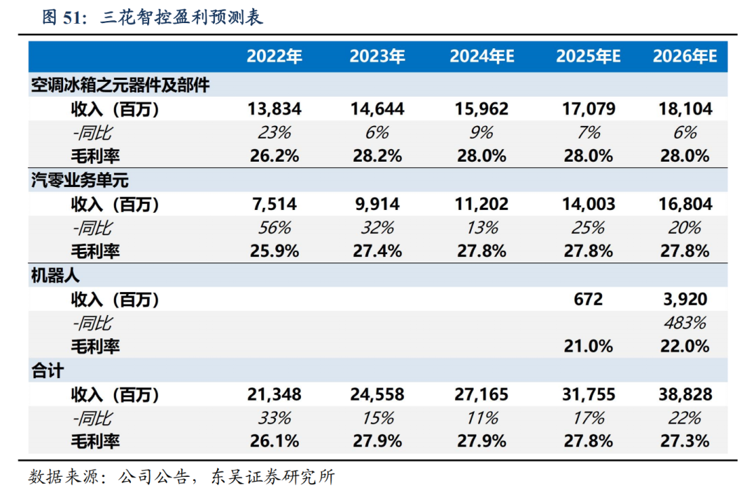 汽车增速25年恢复20%左右增长,家电业务稳定5-10%增长,贡献稳定现金流。1)汽车方面,公司热管理系统核心模块全品类布局,电子膨胀阀市占率50%+、集成市占率60%+,24年由于第一大客户特斯拉销量持平、且欧美电动车销量低迷,公司汽零业务增速降至10-15%,预计收入/利润110-115/15-16亿元,展望25年特斯拉销量恢复20%增长,叠加欧洲25H2新车型放量,且国内新势力华为、小米、理想等销量强劲,汽零板块营收增速恢复至20%左右。 2)家电方面,公司空调制冷阀类、微通道、Omega泵等各品类份额基本全球第一,24年受益于家电国补、以旧换新等带动全年营收实现同增5-10%,预计贡献利润约15亿元,25年营收增速维持5-10%。综合看,24年传统主业利润有望达31-32亿元,25年维持15-20%增长至36-38亿元,未来保持稳健增长。