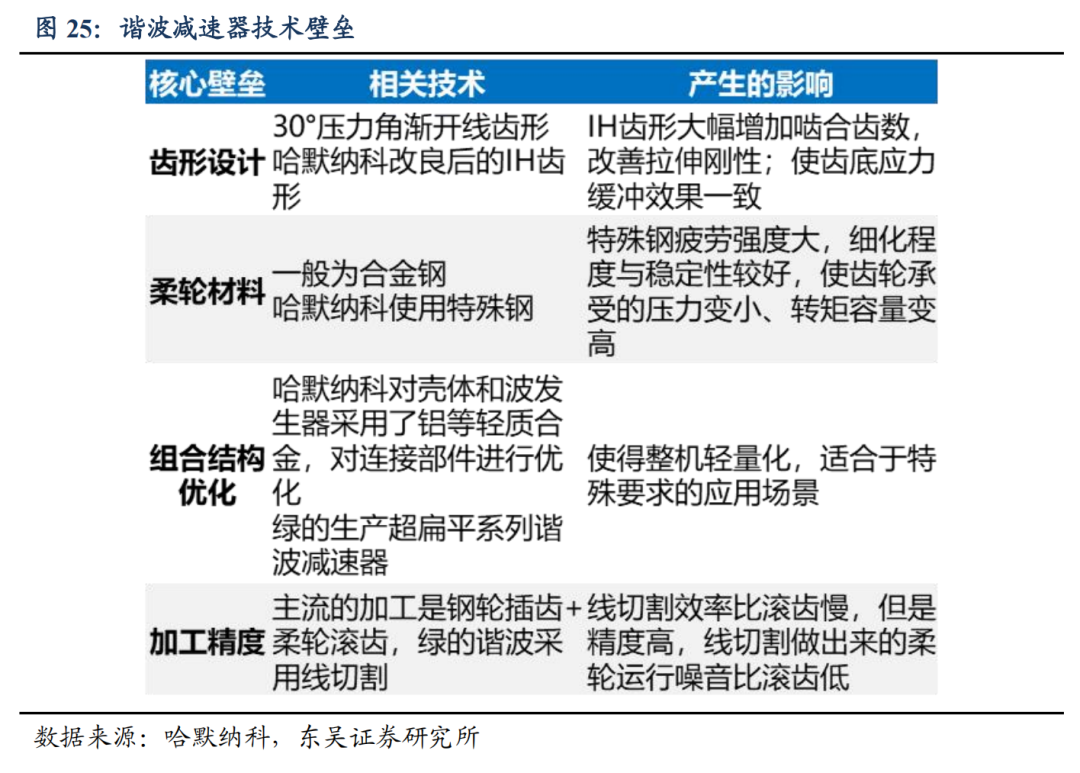 小扭矩电机+高减速比减速器,同时具备体积小+扭矩大优势。减速器能够显著提升扭矩输出值,适配相应高扭矩密度的应用场景,谐波减速器优势是体积小、力矩大,但透明度低,需搭载力矩传感器。