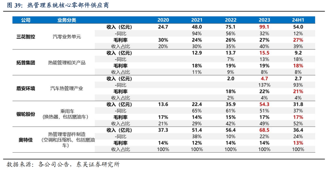 热管理竞争格局:三花全球热管理市占率25%+。按照前面测算,2024年热管理系统阀泵等核心零部件全球市场空间为400亿,增长35%+(不考虑空调和前端模块、电子压缩机、PTC、水冷板等),按照2024年三花汽零业务收入增长10%至110亿+预测看,对应市场空间为25-30%,份额有所下降,主要由于比亚迪及其他自主品牌配套单车价值量下降(非热泵/车企自供部分零部件)。