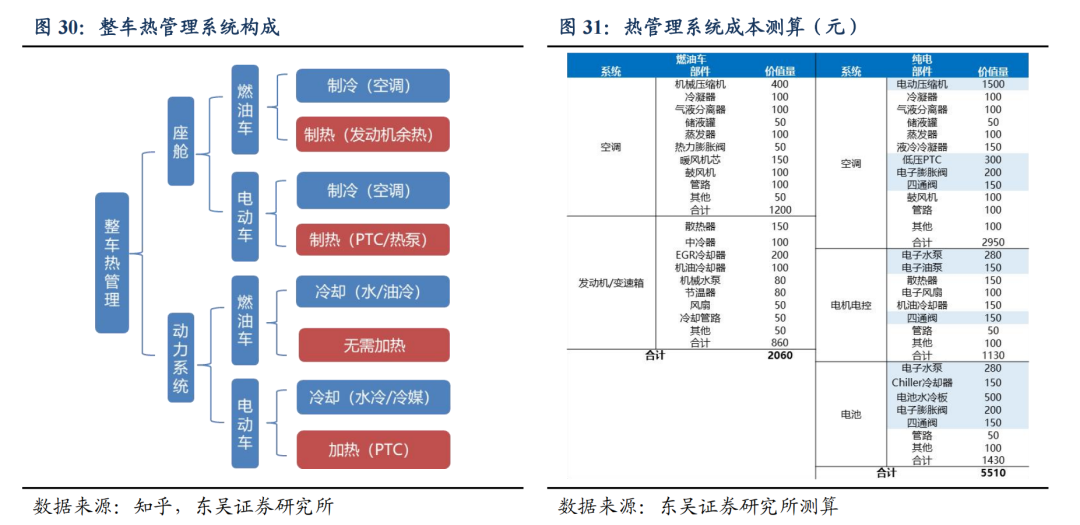 电动车热管理系统新增多种电子零部件,单车价值量高3k元+。燃油车热管理以机械零部件为主,包括蒸发器、压缩机、冷凝器、散热器、油泵、膨胀水箱、冷却液管路、气缸体、油冷器、恒温器等。而电动车动力系统热管理,新增加换热器、多向水阀、电子膨胀阀、PTC等;驾驶舱热管理增加电子膨胀阀、截止阀、四通换向阀等,以便控制制冷剂流量和流向。