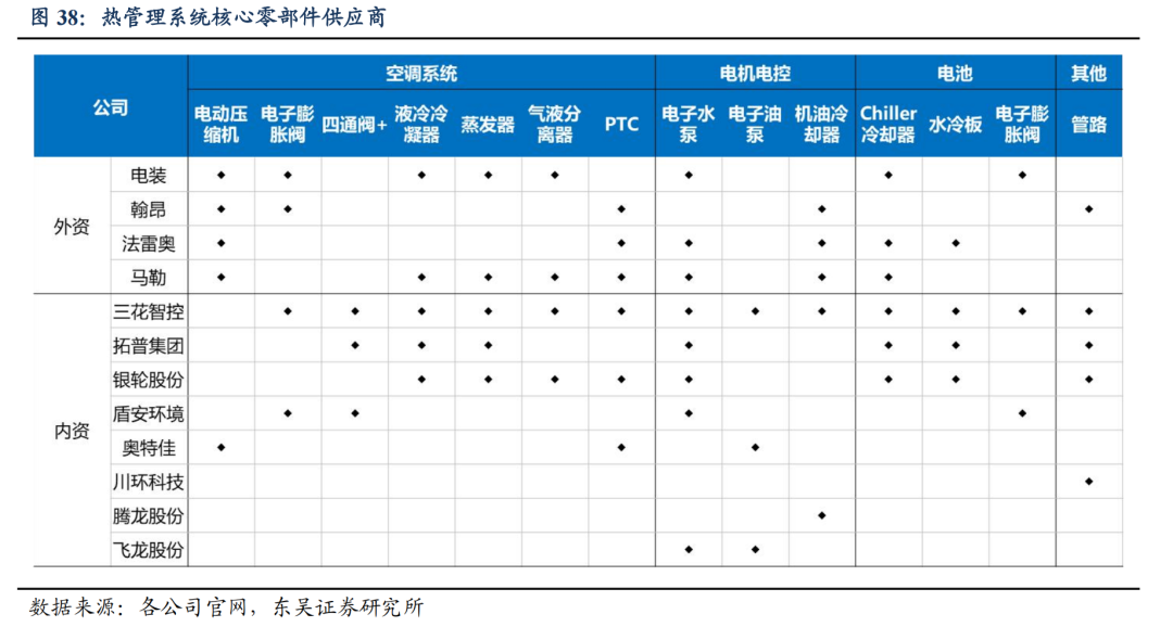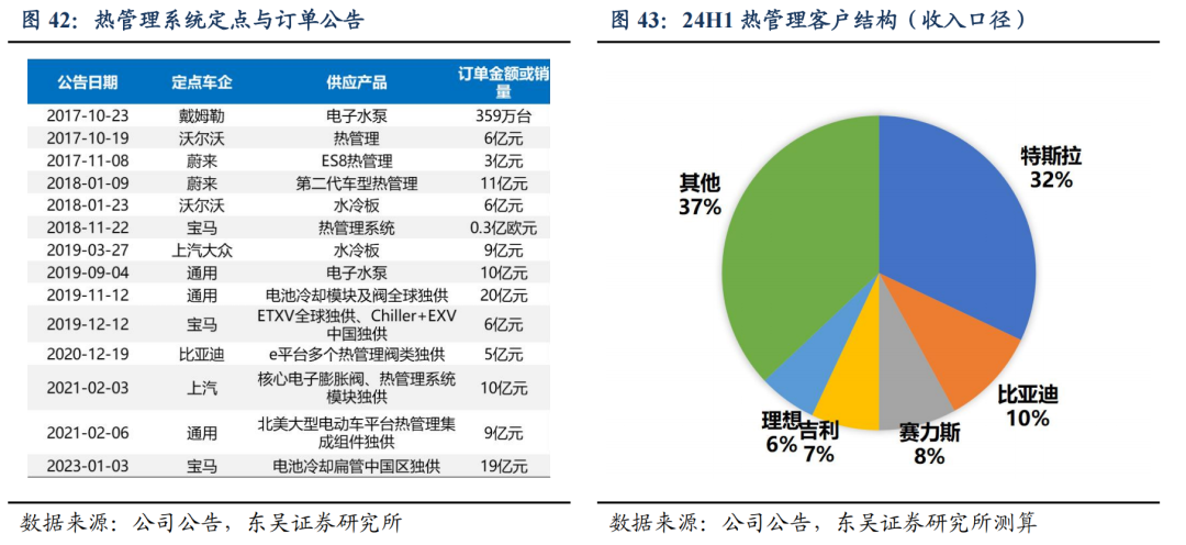三花电子膨胀阀具备领先优势:深耕20年,2002年批量生产空调电子膨胀阀,2009年开始研发车用电子膨胀阀,2014年开始量产,首创车用电子膨胀阀,全球份额超50%。