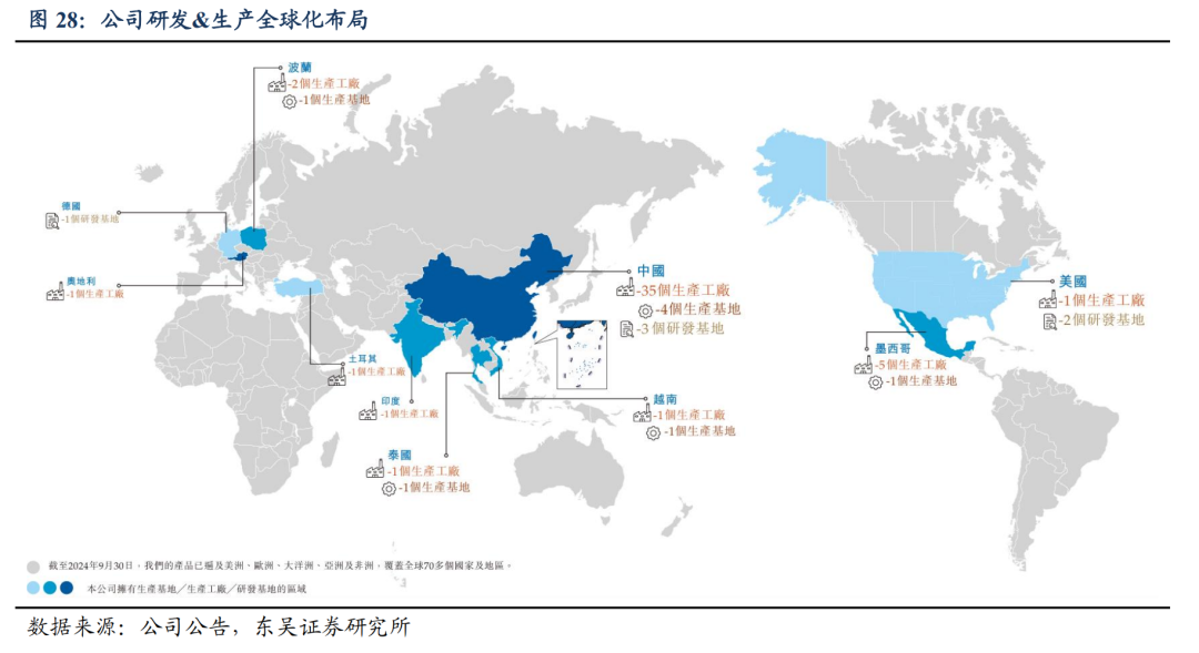 全球化生产布局:自上世纪九十年代起,公司着重开拓国际市场,目前已在美国、波兰、墨西哥、越南、印度、泰国等地建立海外生产基地,已具备全球化的生产应对能力,为尤其是美资客户提供了相比竞争对手更安全的订单保障,这在大客户供应链评估中成为重要加分。