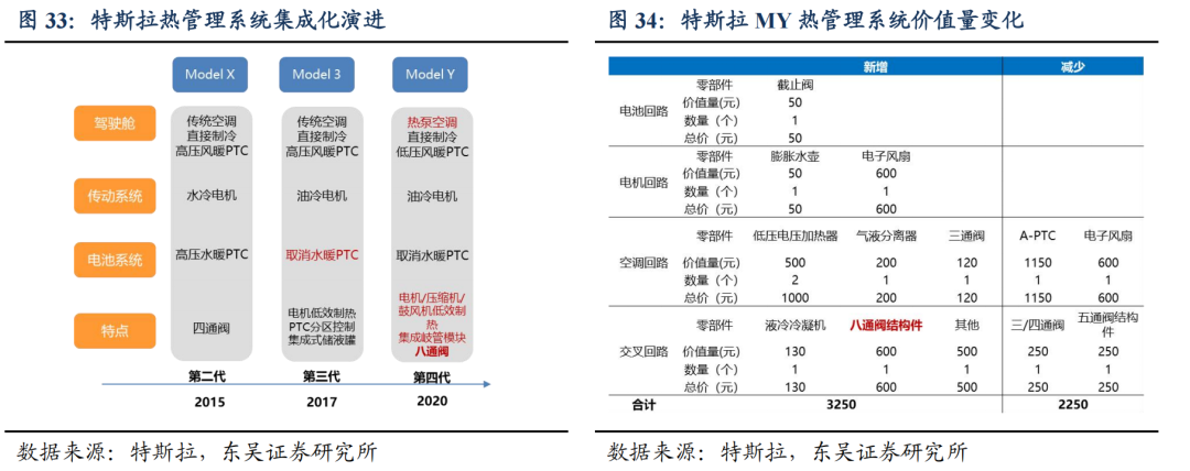 集成化有利于整车统筹能量管理,效率最大化。集成化的热管理系统利用多通道阀门或管路,将电池、电机电控和空调系统回路打通,形成一个大循环回路,统筹能量管理。以Tesla Model Y为例,设计出八通阀(类似四通阀集成),实现电池、电机、空调三大回路的串联和并联,我们预计单车价值量较Model 3高1k+元。