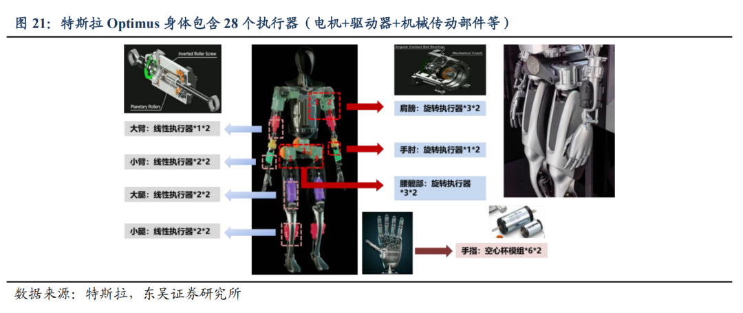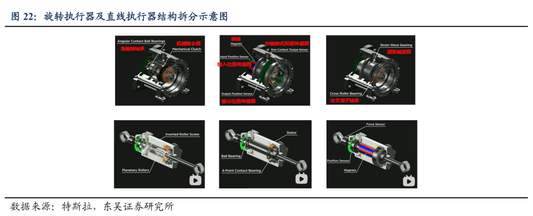 身体执行器初步定型,为最核心部件,三花紧密配合,技术性能基本达标,后续方案微调仍将保持主供地位,关注大规模量产降本:目前量来看,Optimus机电执行器系统含3大类、40个执行器—身体14个旋转执行器、14个线性执行器,手部12个空心杯模组(技术方案未定型),上述执行器均由“电机+传动装置+各类轴承+传感器”组成。关节方案设计和性能直接影响运动范围、精确度和可靠性。