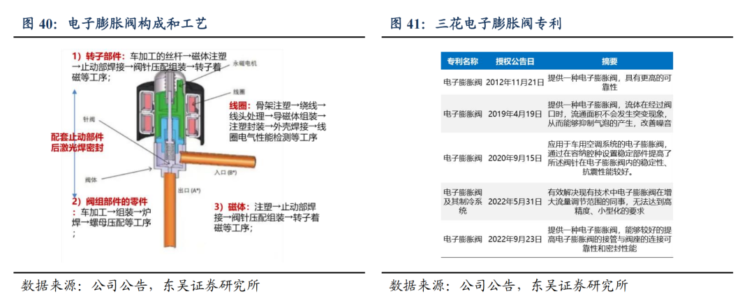 电子膨胀阀工序复杂,软硬件结合,三花专利完善构筑壁垒:车用工况复杂,对电子膨胀阀密封性和耐用性要求高。电子膨胀阀主要由阀体、压力传感器、温度传感器和控制器组成,通过控制步进电机从而控制流量。机械部分由阀体和线圈两部分组成,其工艺流程不同。阀体部分工艺重点在于机加工、装配、焊接和总装检测;线圈部分重点在于线包的制作、封装以及电气性能检测。总体需经过30多道工序,囊括几十个细小精密零部件,软硬件结合,壁垒高。