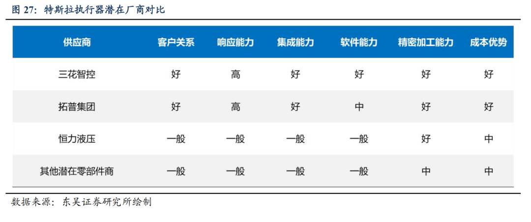 特斯拉的执行器开发认证时间长,需快速响应、及时调整,而公司为特斯拉热管理主供,已有丰富供货经验。公司从2022年开始配合特斯拉开发执行器,已经过3年时间,期间特斯拉不断调整、反馈技术方案,需公司改进图纸、生产样品。而新厂商,从丝杠拓展至执行器,需要2年时间,且难以像公司一样进行全面覆盖。