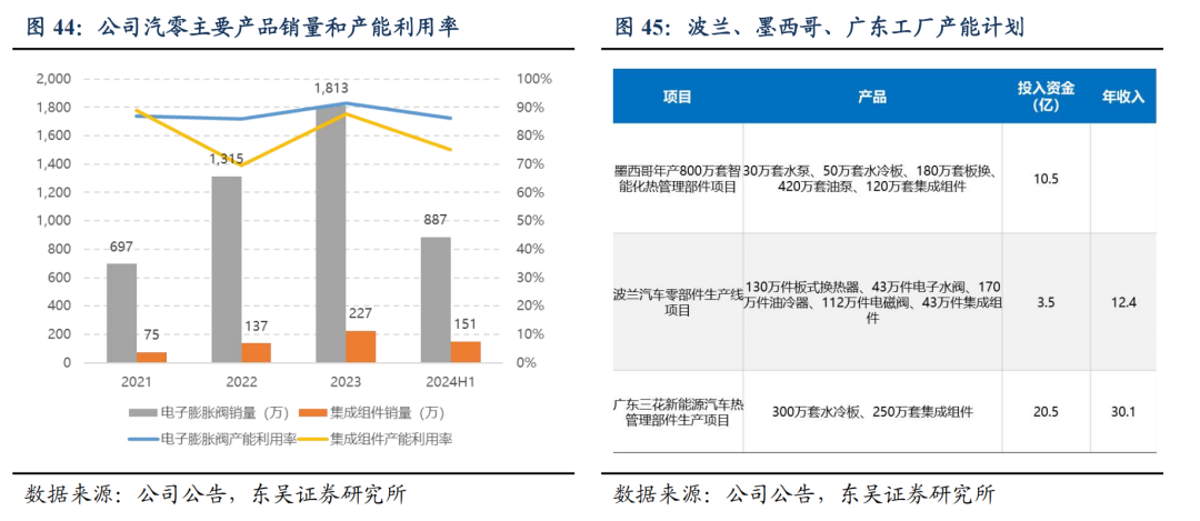 公司产能利用率高:2023年公司车用电子膨胀阀销量1813万套,产能利用率92%,集成组件227万套,产能利用率88%。国内拟建广东项目,投资金额20.5亿。