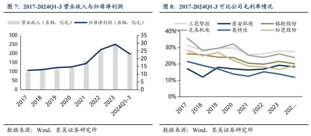 零部件龙头优势稳固,收入利润高速增长。近年来在新能源汽零高景气拉动下,公司收入利润规模实现高速增长。2024Q1-3公司实现营业收入206亿元,同比增长8%,归母净利润23亿元,同比增长6.6%,家电行业较为景气,汽车热管理增速有所放缓。
