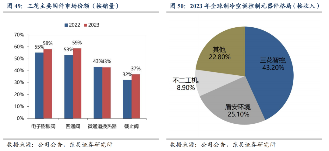行业集中度上升,23年公司总体市占率达43%。随着制冷空调控制元器件市场技术壁垒及规模优势日益凸显,全球市场集中度呈上升趋势。按2023年收入计,全球三大制冷空调控制元器件制造商占约77%,其中三花市占率约43%。
