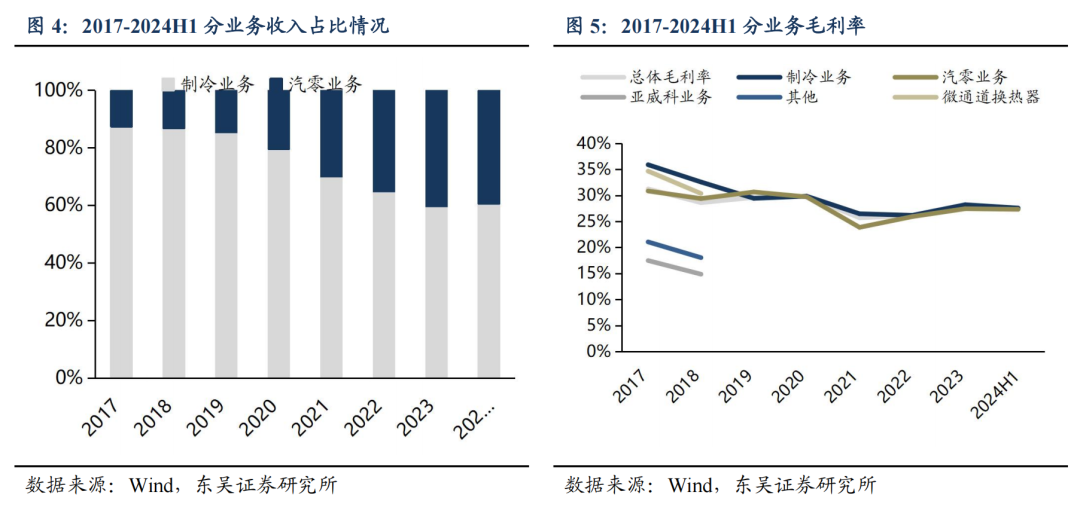 公司主营业务为机械电子控制部件和组件类产品的研发、生产和销售,根据产品应用领域分为制冷空调电器零部件和汽车零部件业务。制冷空调电器零部件致力于建筑暖通、电气设备专业化经营,汽车零部件业务专注于汽车热管理领域的深入研究。24H1汽零业务营收占比近40%,制冷、汽零业务毛利率均维持27%+。