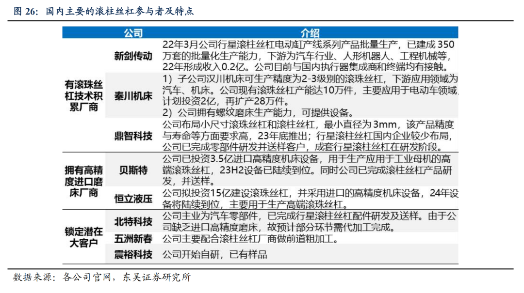 电机+丝杆满足直线运动的负载、精度等要求。人形机器人双足、双臂采用连杆结构,连杆末端采用“电机+丝杠”结构,能够满足刚性、载荷、运动精度和连续性要求。丝杠采用滚柱丝杠和T型丝杠。